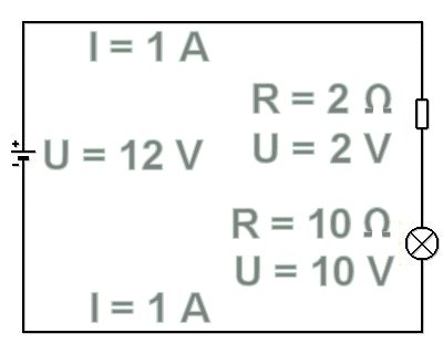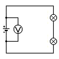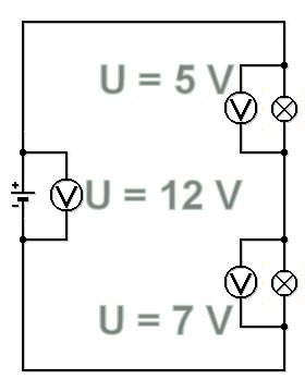 The next picture shows several serially connected consumers. On each consumer there is a voltage. The voltage is measured using the method shown in the picture. If otherwise, no major resistance exists, the sum of
