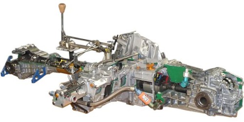 fast komplette Antriebseinheit, natürlich ohne Motor und Antriebswellen. Gefahren wird im Prinzip nach oben links. Also befindet sich das Getriebe hinter dem Fahrersitz.