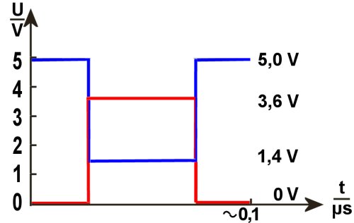 Datenleitung gegen Minus. Was erwarten wir? Jedenfalls nicht Spannungen bei einem deutlich über der Mitte zwischen 1,4 und 5 V und beim anderen deutlich unter der Mitte zwischen 0 und 3,4 V. Wenn das so ist, dann