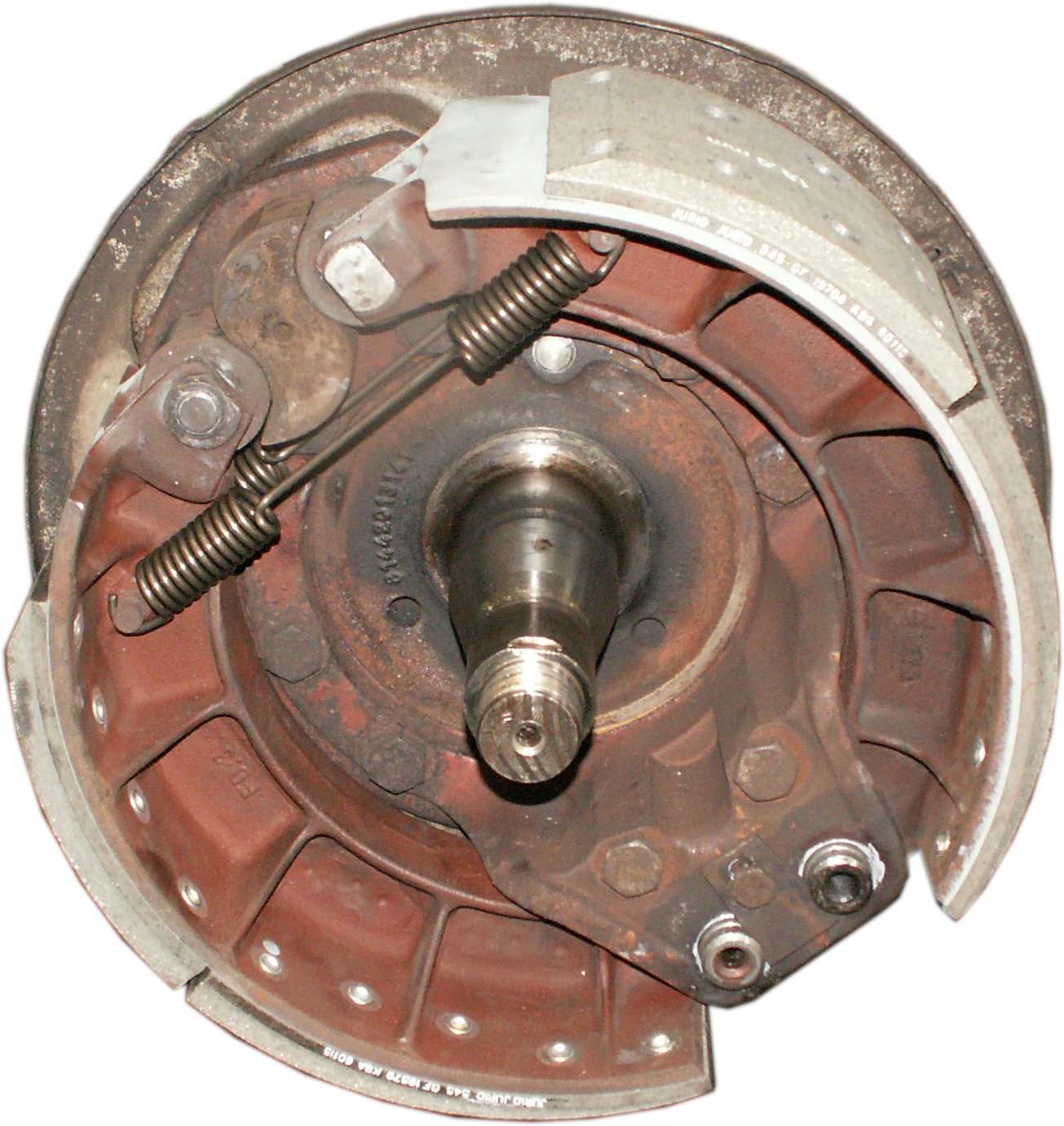 Wie gut, dass schon früh die Innenbackenbremse (Bild oben) erfunden wurde, bei der die enormen Kräfte von schätzungsweise 10.000 N voll der Reibung zwischen Bremsbacken und Trommel zugutekommen.