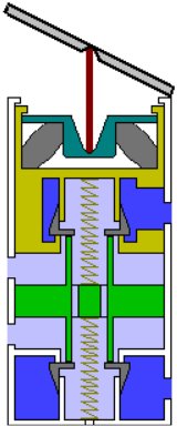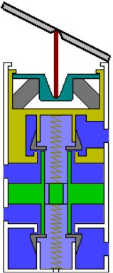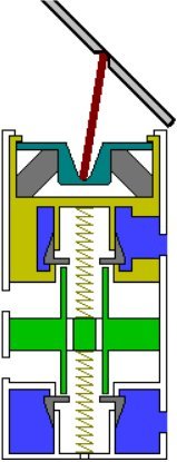 den Druckräumen oben und unten geöffnet. Für einen kurzen Moment wirkt der volle Druck von oben und unten auf den Wiegekolben, der dadurch und wegen der beiden Federn oben und unten eine mittlere Position