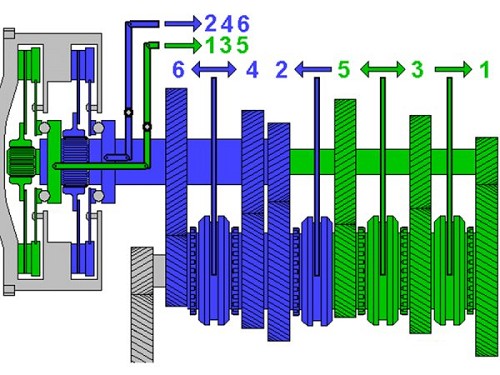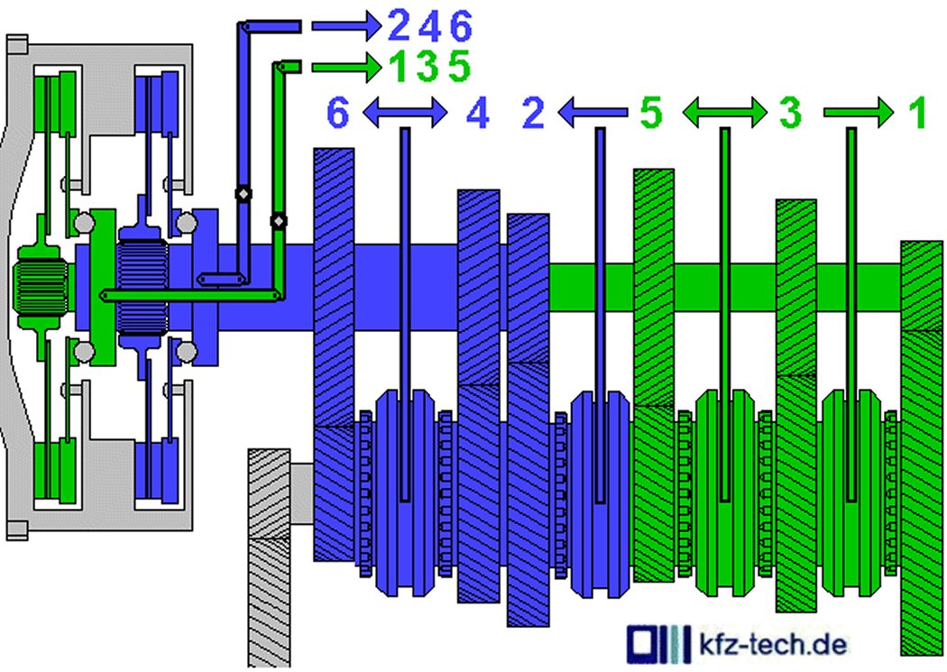 und die ungraden (grün, heller) jeweils zu einem Teilgetriebe zusammengefasst und je einer der beiden Kupplungen zugeordnet, die getrennt zu betätigen sind. Trotz Ähnlichkeit handelt