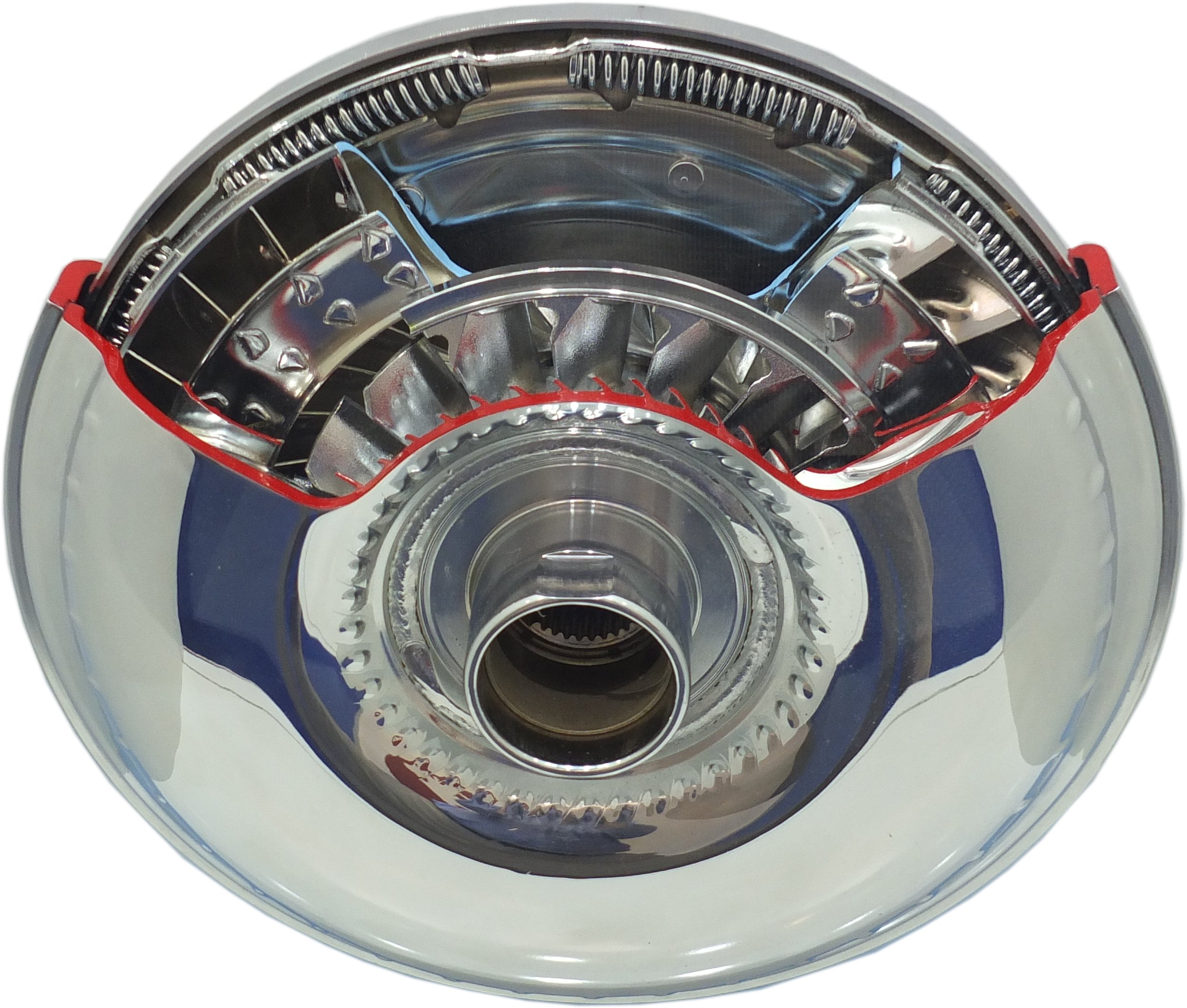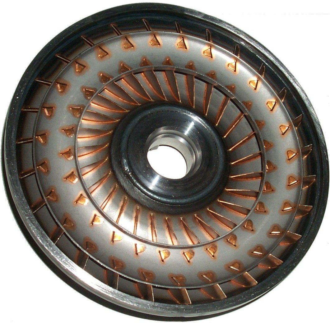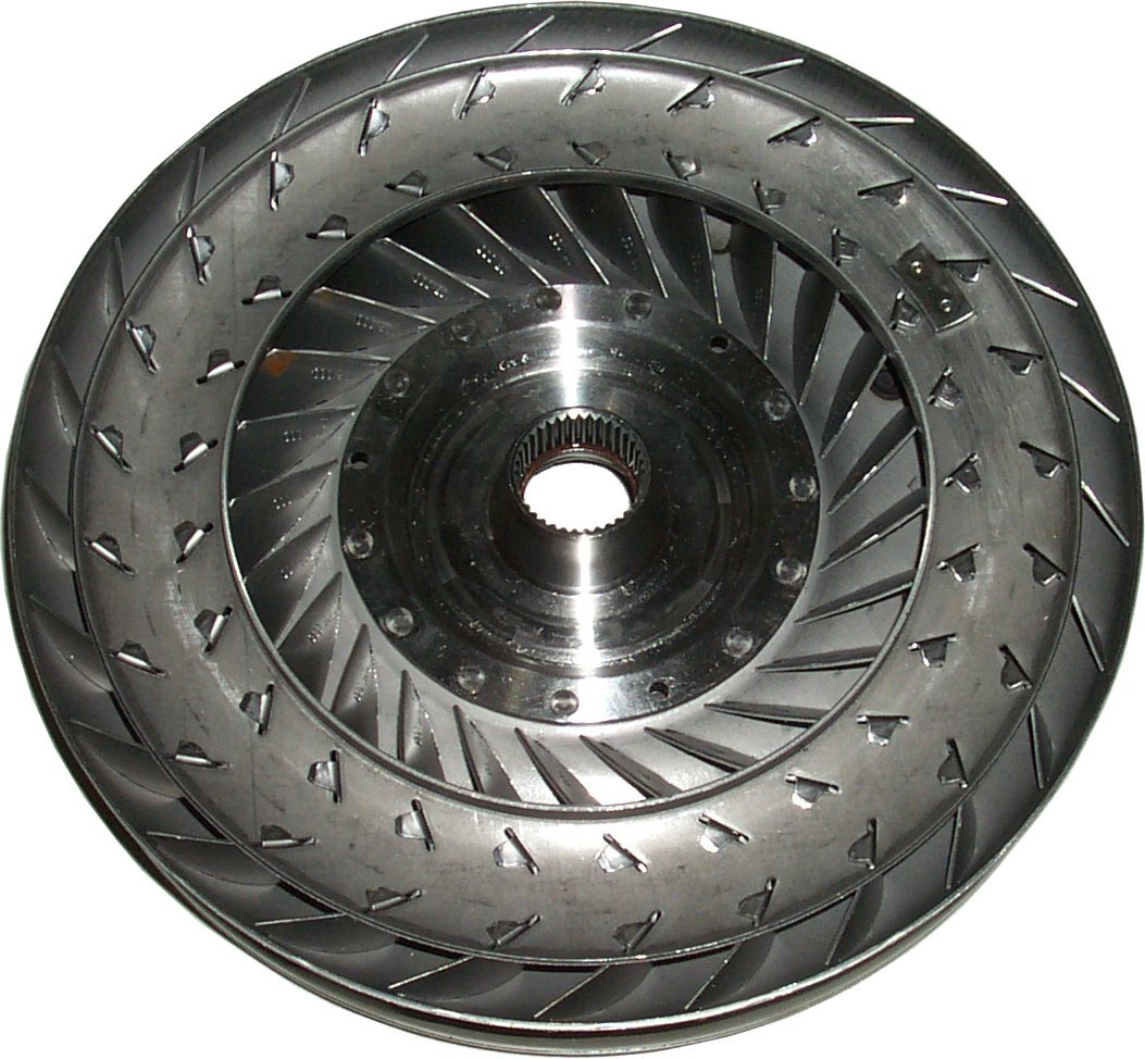 Schauen Sie sich das Turbinenrad ohne Leitrad an. Es wird so angetrieben, dass es gegen den Uhrzeigersinn dreht. Das vom Pumpenrad kommende Öl verschwindet also in den Taschen am äußeren Rand.