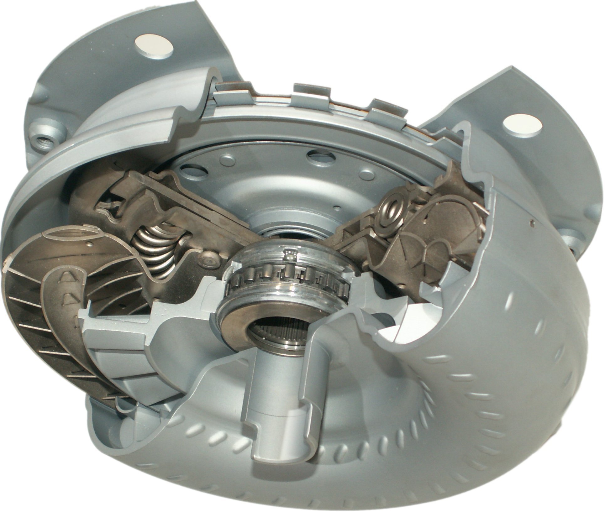 Solange das Leitrad stillsteht, spricht man vom Wandler-, wenn es mitdreht vom Kupplungsbereich. Um in letzterem die Verluste etwas geringer zu halten, gibt es die Wandler-Überbrückungskupplung, unten im