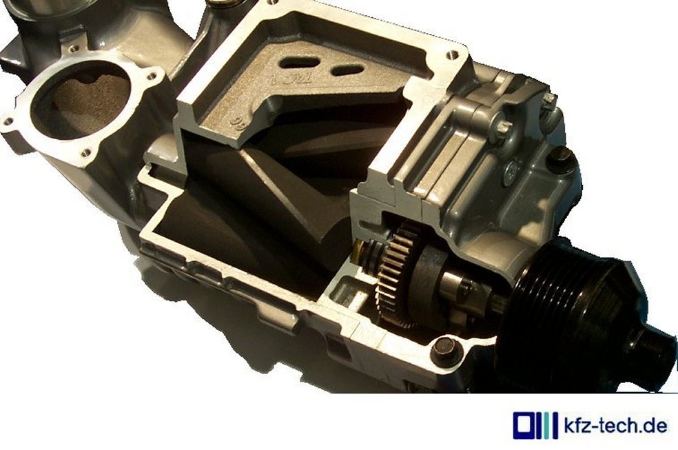 umlaufenden Räume. Die Drehung erfolgt mit höherer Drehzahl von der Kurbelwelle aus, wobei kaum Leistung übertragen wird, in manchen Betriebsbereichen sogar welche zurückkommt.