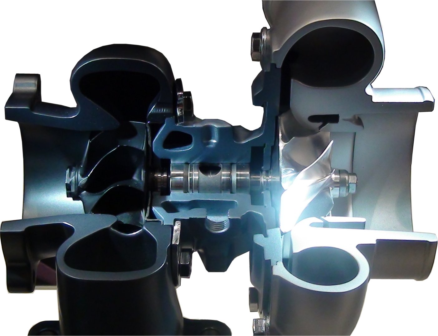 Turbinenrades und damit Verbindung direkt zum Abgasstrang, gibt es inzwischen feine, mit festen Drehpunkten versehene, verstellbare Flügel, die den Druck aus dem Auslass unterschiedlich wirksam auf die Flügel der