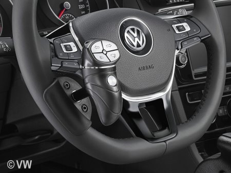 Auch die Benutzung des Lenkrads mit nur einem Arm ist möglich. Dazu kann der Wischhebel z.B. nach links verlängert werden und es gibt dort ein Element mit einem kleinen Tastenfeld, das der Bordelektronik über