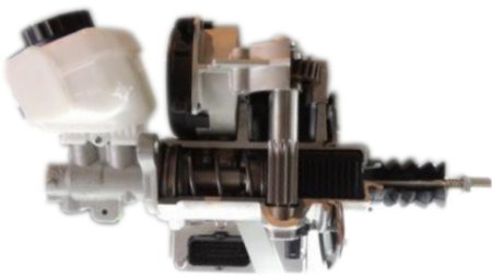 En la parte posterior se puede ver el vástago del pistón, que está conectado al pedal del freno como de costumbre. El actor principal es el motor eléctrico en primer plano, que genera la presión de frenado