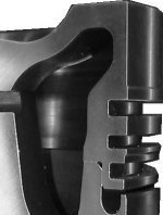 schwerer. Beim Kolben oben verbindet eine Dehnschraube die beiden Teile. Rechts und links daneben ist der umlaufende Kanal für die Ölspritzkühlung erkennbar.