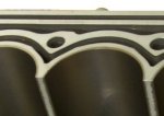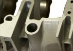 nur in den Hohlräumen unmittelbar um die Zylinder. Wie tief die Kühlung der Zylinder reicht, ist außen an den Zylindern 1 und 4 erkennbar. Die Laufbuchsen aus Gusseisen sind vermutlich umgossen worden.