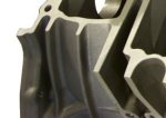 So weit kann man selten in einen Zylinderblock hineinsehen. Es handelt sich um eine Open-Deck-Konstruktion. Von oben sind die fünf Hauptlager der Kurbelwelle sichtbar. Offensichtlich steht das Kühlmittel