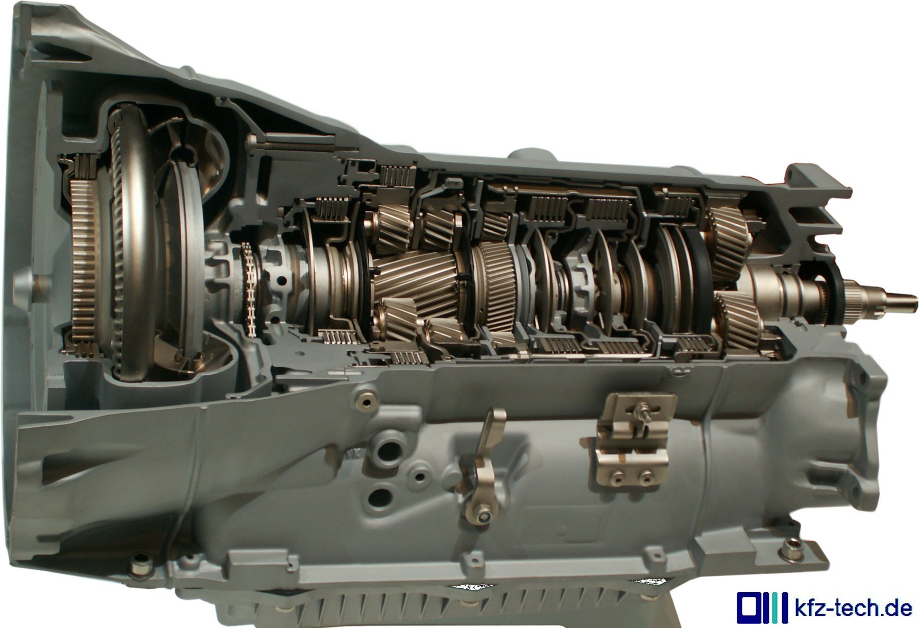 Durch die im Getriebe zusätzlich eingebauten Lamellenkupplungen und die Planetensätze wirkt sie nach außen hin wie ein großer Zylinder. Allerdings ist unten noch eine Steuerung mit Ölwanne angeflanscht.