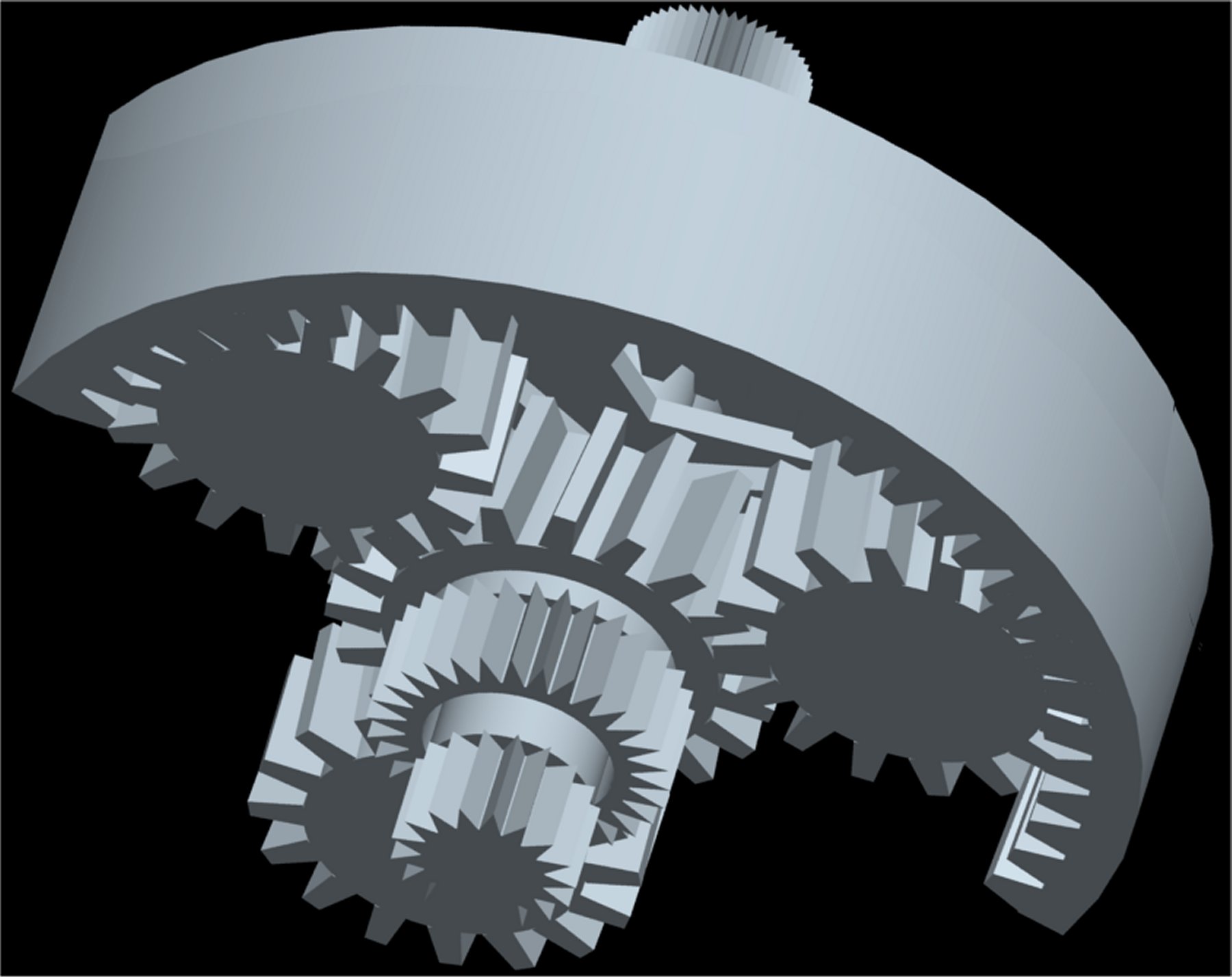 Eines der Planetengetriebe in so einer Automatik besteht zumindest aus einem Sonnenrad in der Mitte und einem Hohlrad außen. Zwischen beiden und mit beiden kämmend, zwei bis vier Planetenräder. Deren