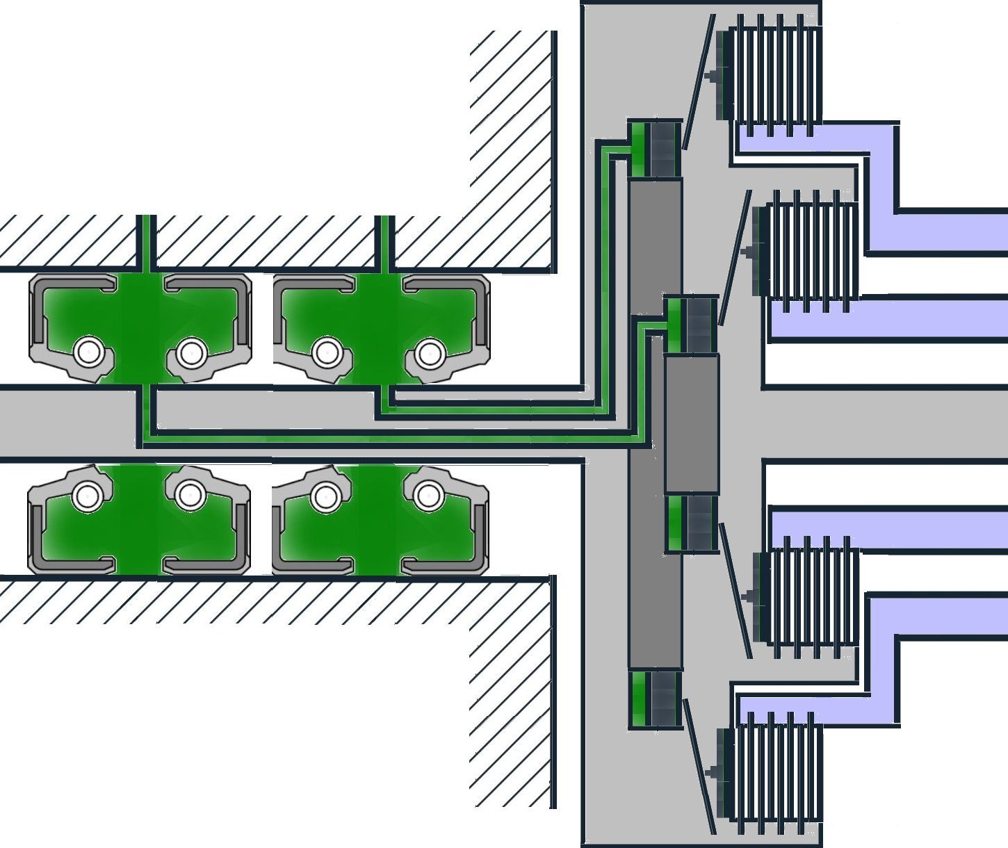 Und wie ändert das Steuergerät die Verbindungen? Das Bild unten zeigt prinzipiell, wie es mit Öldruck zwischen zwei Lamellenkupplungen hin- und herschalten kann. Es gibt z.B. Druck auf die obere linke