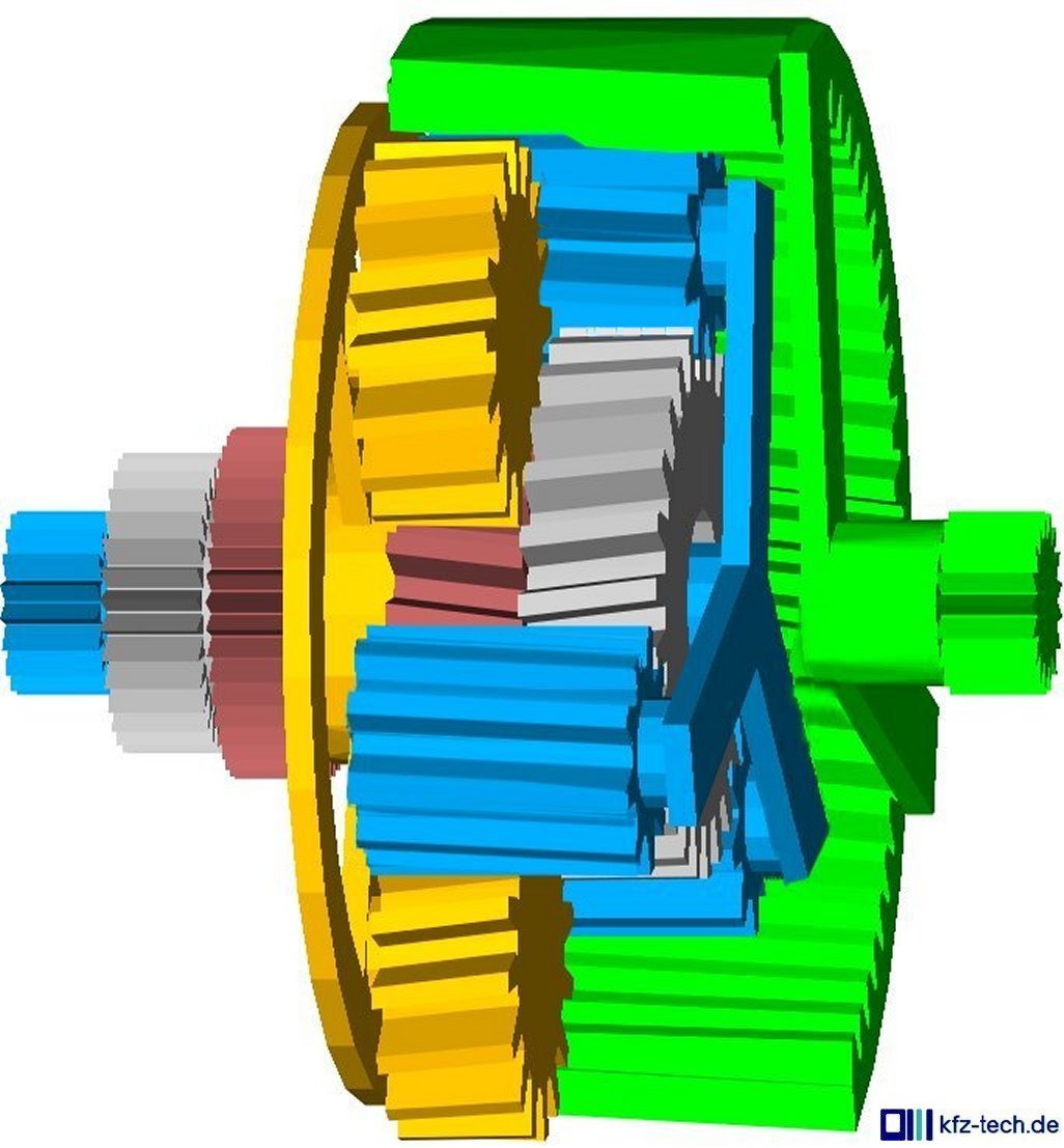 Sie mögen sich jetzt bitte vorstellen, dass die Welle für das Sonnenrad von Motor kommt, die des Planetenradträger festgebremst und das Hohlrad mit dem Achsantrieb verbunden wird, Das wäre schon die