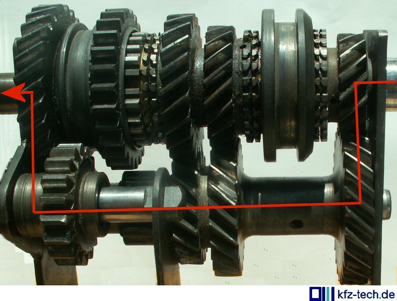 Obwohl das Getriebe im Moment kein Drehmoment überträgt, sind jeweils zwei Gangräder für die einzelnen Gänge miteinander verzahnt, nur der gradverzahnte Rückwärtsgang nicht. Ein Gang wird also, außer beim