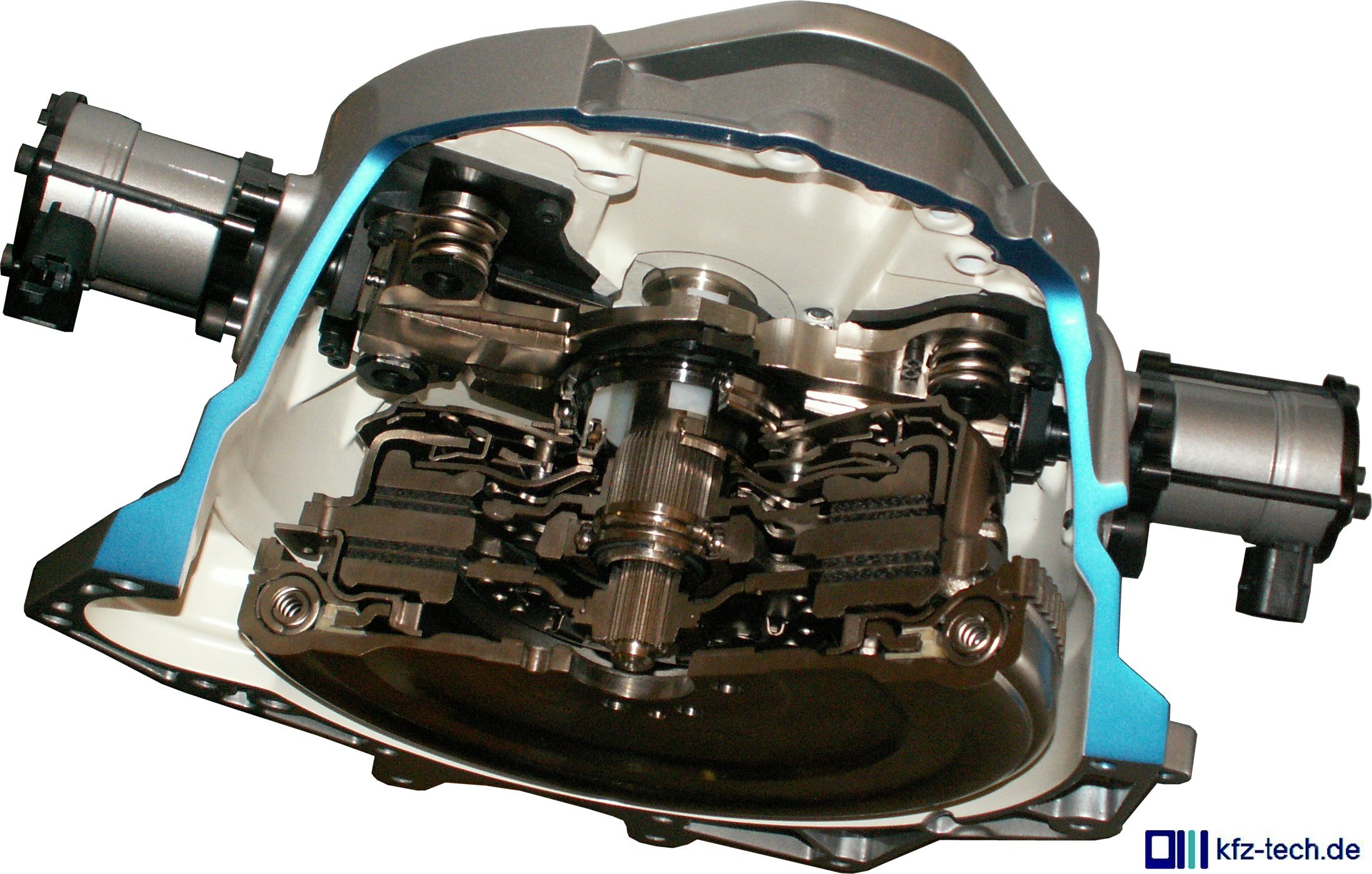 Sie schauen hier vom Motor aus auf das Schwungrad und dahinter eine Kupplung mit zwei Kupplungsscheiben. Für jede der beiden steht weiter hinten seitlich ein Betätigungsmotor zur Verfügung. Jede von beiden