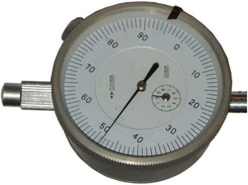 Das Bild zeigt eine Messuhr zur Bestimmung des Kurbelwellen-Axialspiels. Sie muss fest mit dem Zylinder-Kurbelgehäuse verbunden sein und ihr Taststift auf der Kurbelwellenkante, der Riemenscheibe oder dem