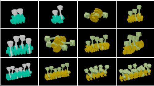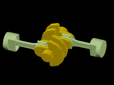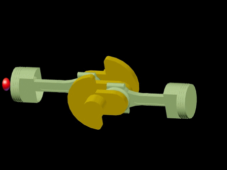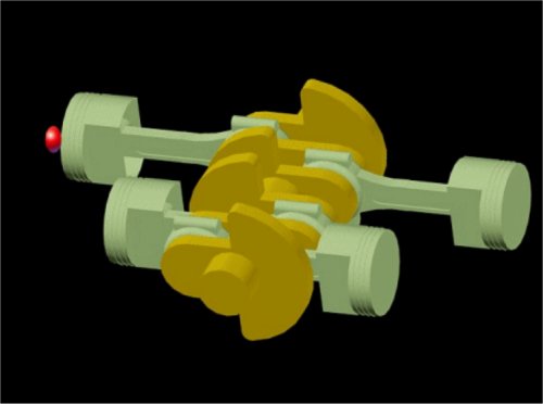Die Kurbelwelle mit Kröpfungen in drei Ebenen ermöglicht die Bewegungen der einzelnen Kolben. Je drei gegenüberliegende Kolben bewegen sich aufeinander zu
