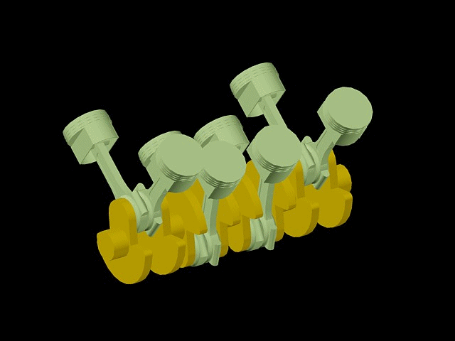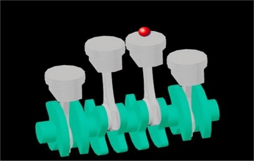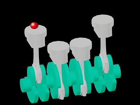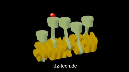 Jeder Kolben hat seine eigene Kurbelwellenkröpfung. Die Kolben durchlaufen ihre Hübe zu verschiedenen