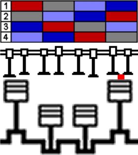 Je zwei gegenüberliegende Kolben greifen über ihre Pleuel auf den gleichen Kurbelzapfen. Alle Takte überlappen um 90°, wobei immer Zylinder verschiedener