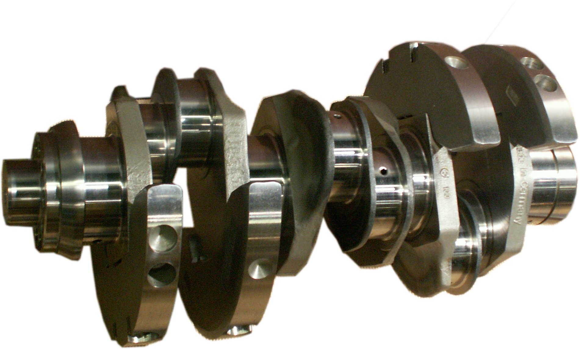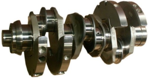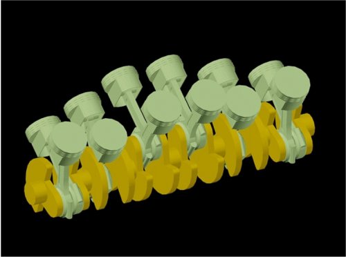 Die Kurbelwelle hat große Ähnlichkeit mit der des Sechszylinder-Reihenmotors, nur dass die Pleuellager anders verteilt sind und Gegengewichte