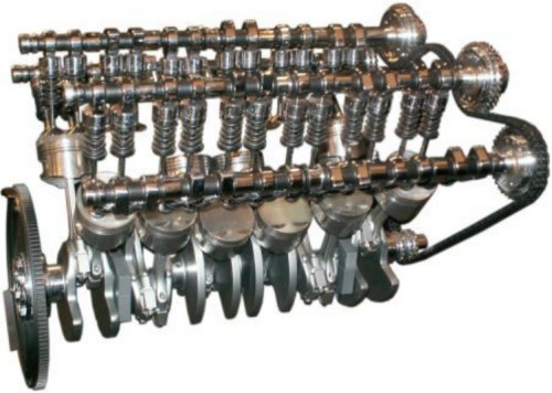 Erstaunlich die relative Einfachheit eines ansonsten nicht alltäglichen Motors. Immerhin sind neben 12 Kolben auch 48 Ventile zu betätigen. Und das alles über eine Doppelreihenkette. Moderne Motoren