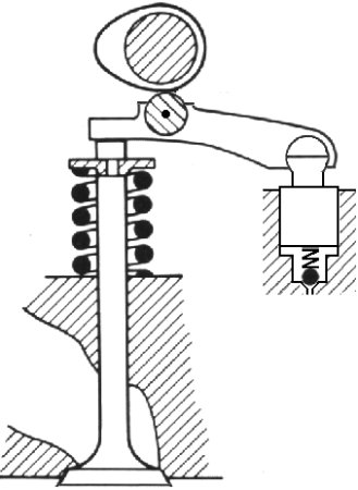 Kipphebel sind auch bei obenliegenden Nockenwellen möglich, wobei diese dann meist eher etwas neben den Ventilen statt oberhalb angeordnet sind. Hier ist im Gegensatz zum vorigen Bild die Einstellmöglichkeit