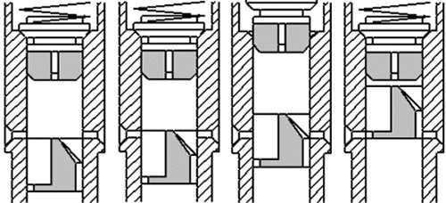 Ab dem Moment, wo die Einlassbohrungen gerade verschlossen werden, beginnt sich ein Druck aufzubauen (von links Bild 2). Überwindet der Druck die Kraft der Feder am Rückschlagventil oben, dann öffnet