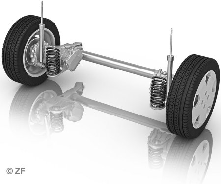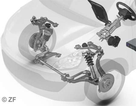 Hier sehen Sie die Realisierung an der Vorderachse. Es ist eine Weiterentwicklung der doppelten Querlenker. Diese bleiben erhalten. Nur greifen die von der Zahnstange ausgehenden Spurstangen nicht direkt auf den