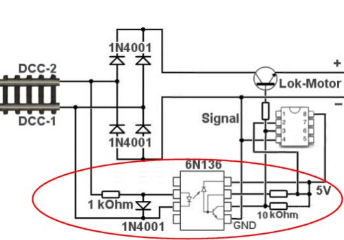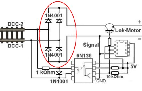 Und wie geht es dann weiter? Bringen wir das Ganze in Funktion, wollen wir zunächst den Lokdecoder Stück für Stück ersetzen. Der erste Versuch beträfe die vier Dioden am Eingang. Die direkt mit dem Gleis