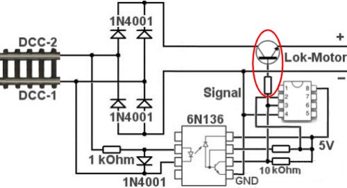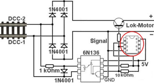 Mit etwas Mut könnte man jetzt den Pin 3 mit dem Widerstand zur Basis des Transistors verbinden und schauen, ob der Lok-Motor auf das Signal reagiert. Man riskiert hierbei natürlich zum ersten Mal den