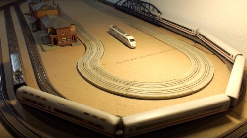 nicht künstlich beschwert. Der Motorwagen von Fleischmann wartet in der Mitte, momentan arbeitslos.