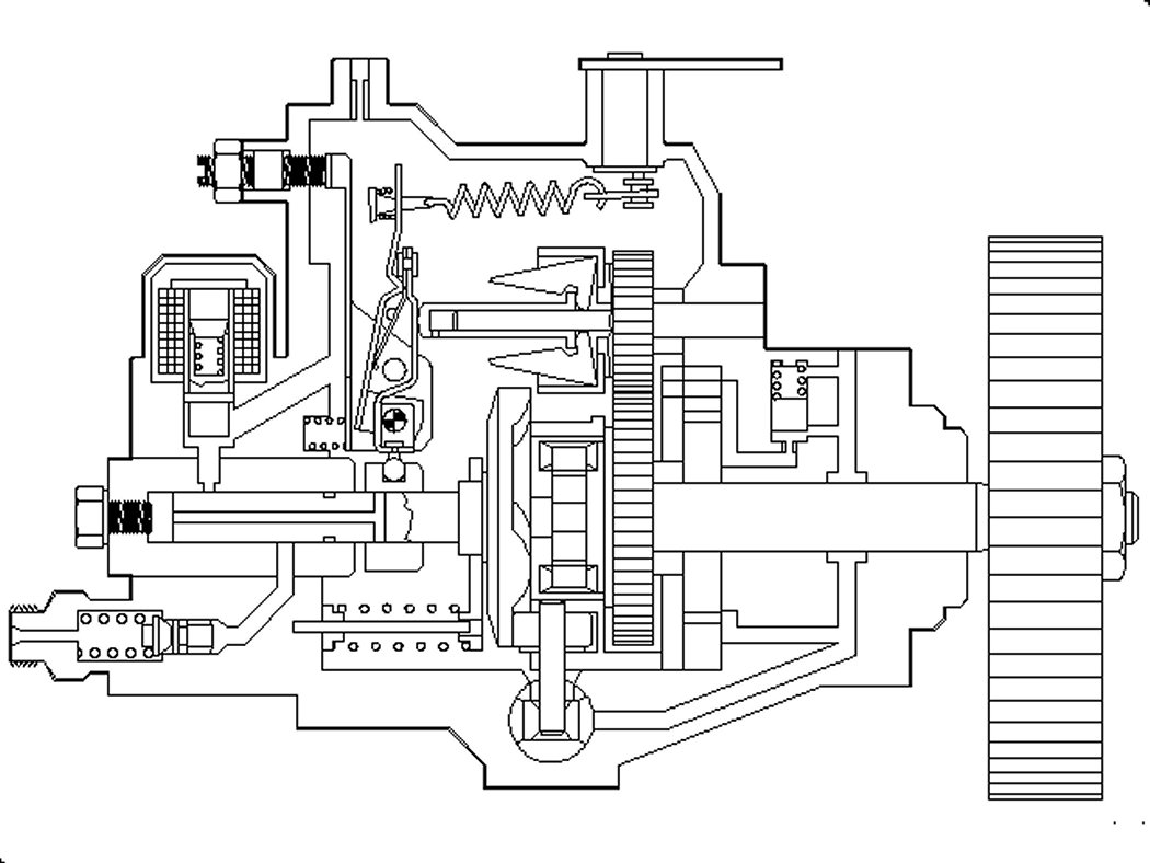 Einspritzmengen regelt. Dazu ist der Druckraum des Verteilerkolbens durch die Mitte mit einer Querbohrung verbunden, die durch einen Ring verschlossen wird. Gibt der die Bohrung frei, sackt der Druck zusammen, was
