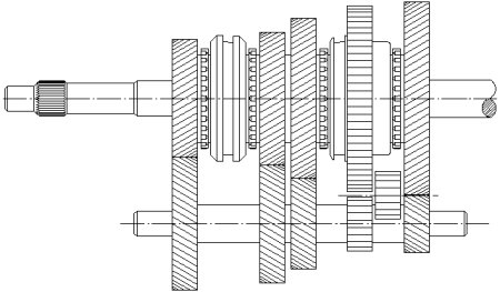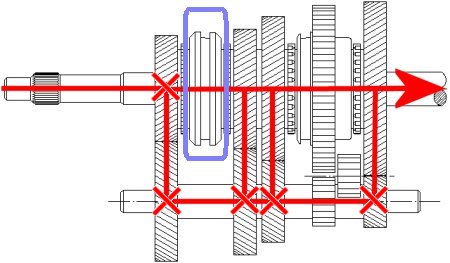 shaft. Its task is to transmit torque to the countershaft under all circumstances, even in this case where it is not needed at all. This is because the shifting sleeve, which is connected to the output shaft in a rotationally fixed