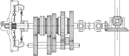 longer standard nowadays. So, in this transmission, the engine is positioned longitudinally at the front, and it continues to the right via the cardan shaft to the rear axle.