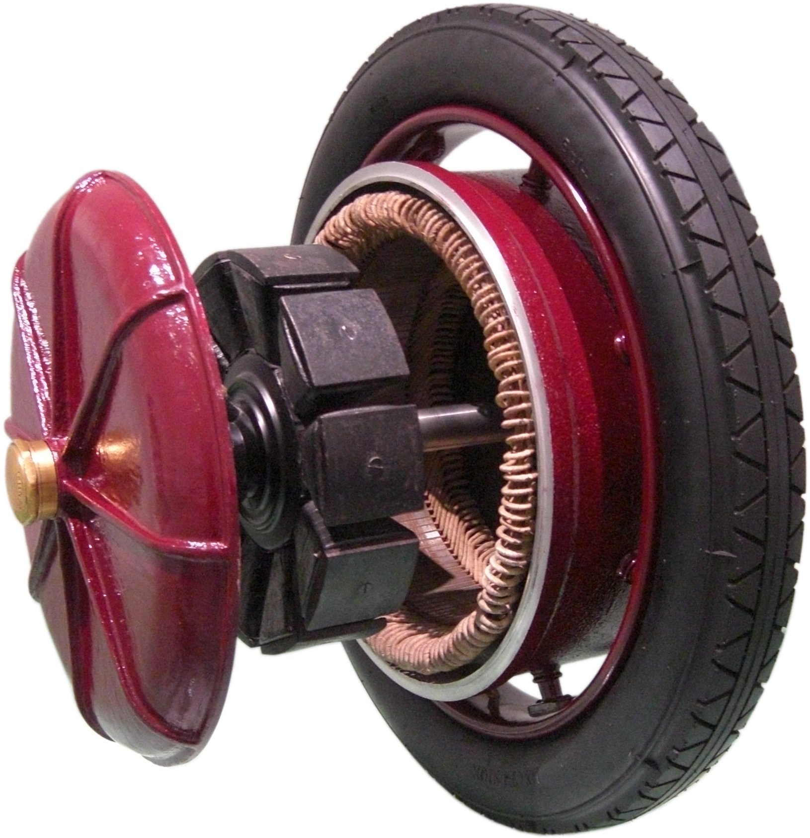 This is a car with two wheel hub motors (pictured above) in normal version and four motors in racing version. The former produced 1.8 kW (2.5 hp) each at 120 rpm for around 20 minutes. It turned out to be an expensive but