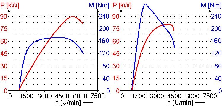 Here you can see the relationship between torque and rotational speed for the gasoline engine on the left and the diesel engine on the right. It should be noted that a curve for torque is fixed at the moment when the one for