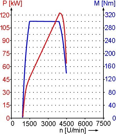 On the right, you can see proof of the claim that performance can increase even though torque decreases. This applies to the range between 2000 rpm and 4000 rpm. This results in the high-speed concept. Attempts are