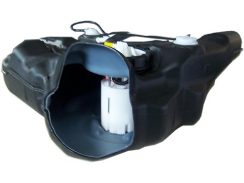 Volvamos al depósito de combustible. Ahora es de plástico, lo que permite rellenar muchos de los huecos que quedan en la carrocería. Pero un depósito de acero inoxidable (imagen inferior) le pisa los