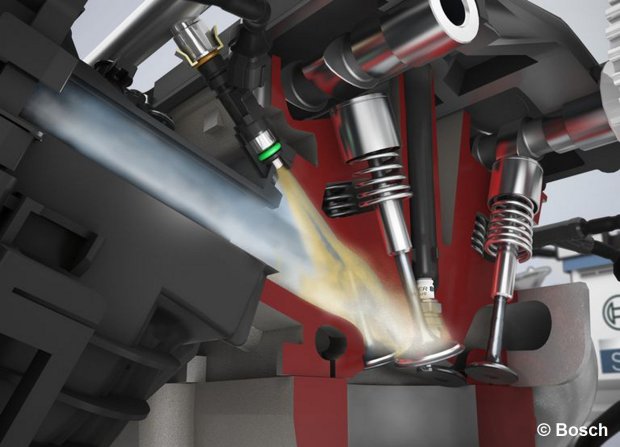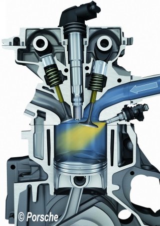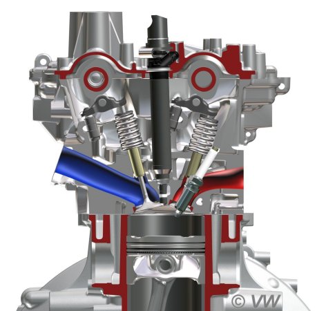 Cuatro válvulas por cilindro, es decir, dos válvulas de admisión, y la alimentación debe ingresar por ambas. Esto no es tan fácil con un solo inyector. También es necesario determinar el ángulo correcto de