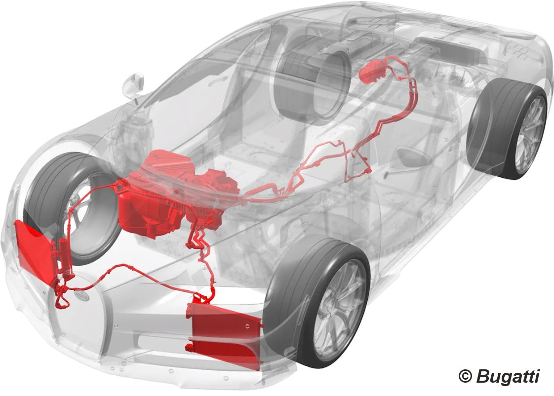 de Bugatti. Debido al motor central, los conductos del aire acondicionado son especialmente largos: 9,5 metros.